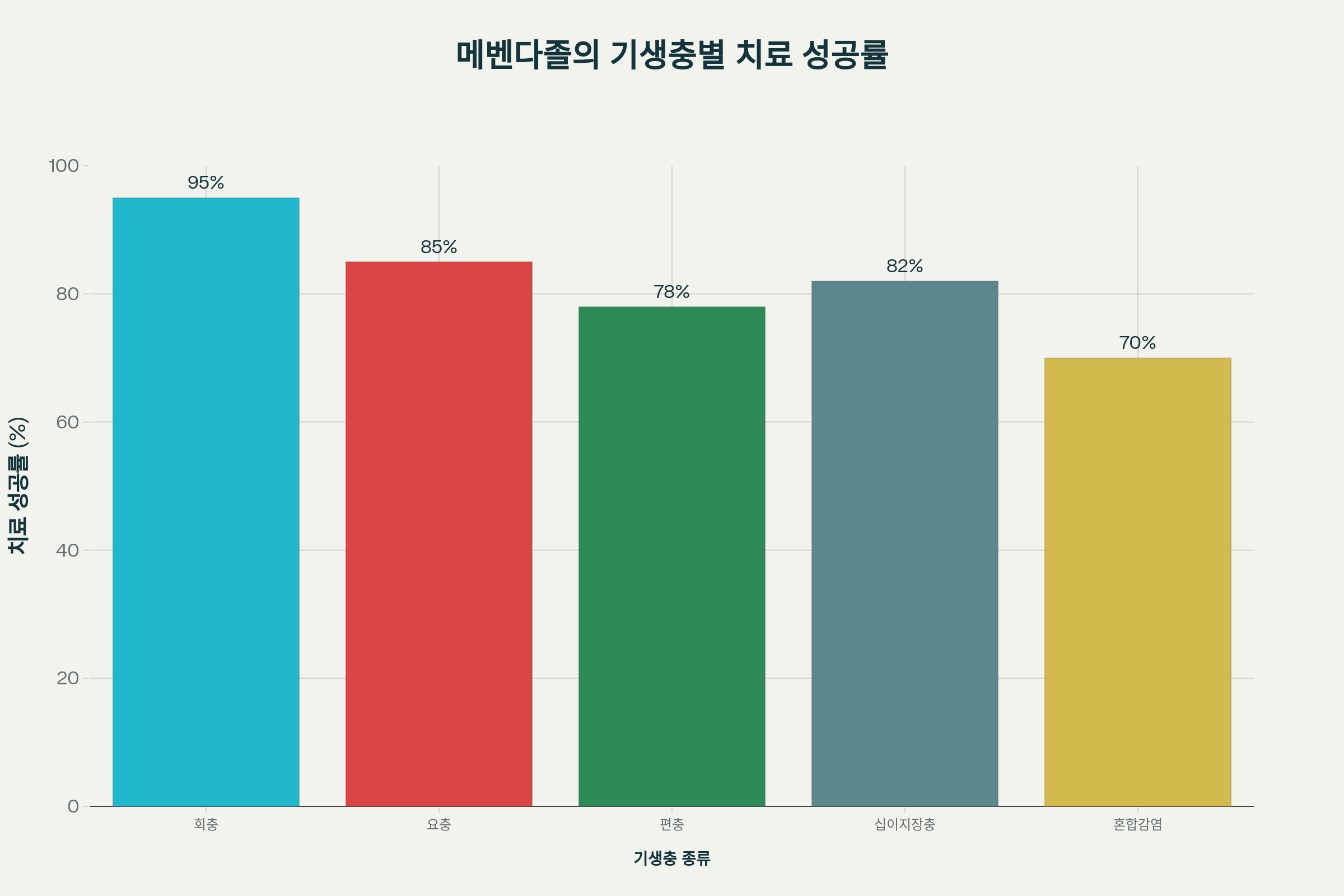 - 회충(Ascaris lumbricoides): 95% 치료 성공률