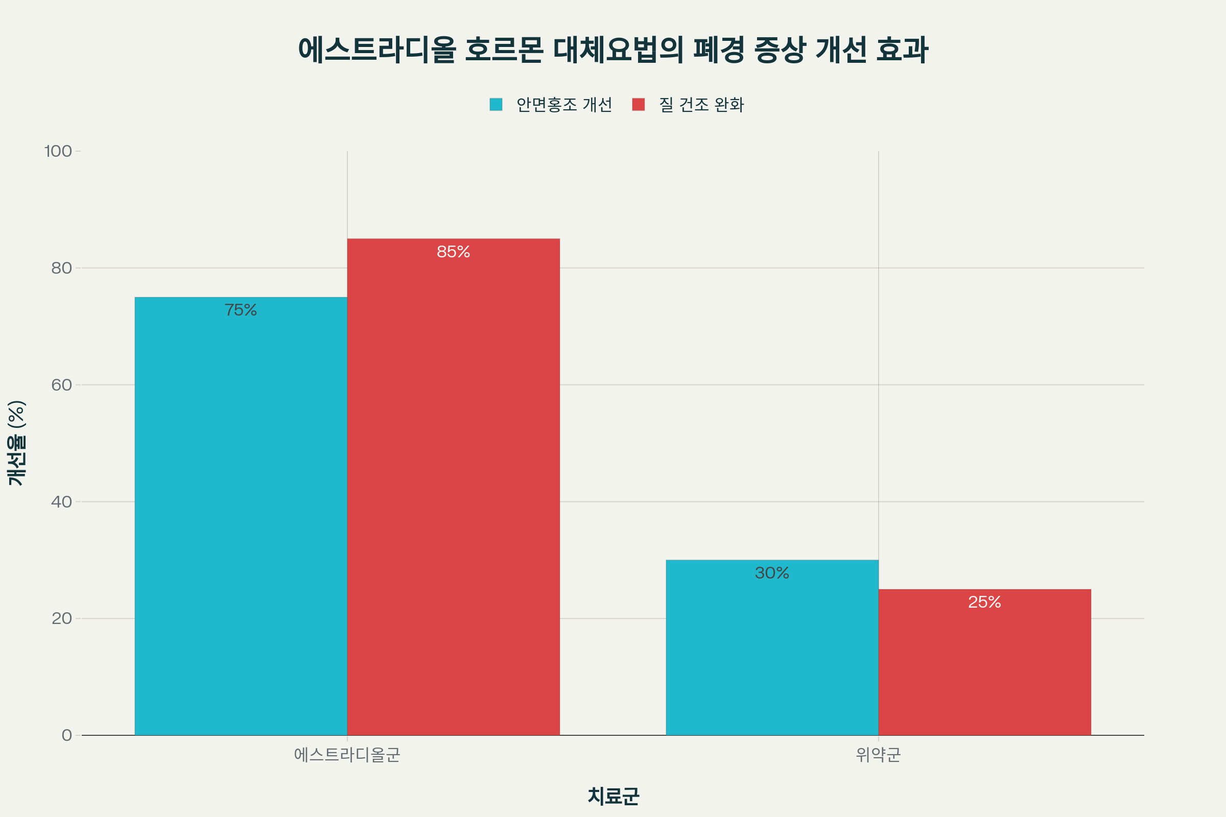 - 질 건조증: 에스트라디올군 85% 완화 vs 위약군 25% 완화