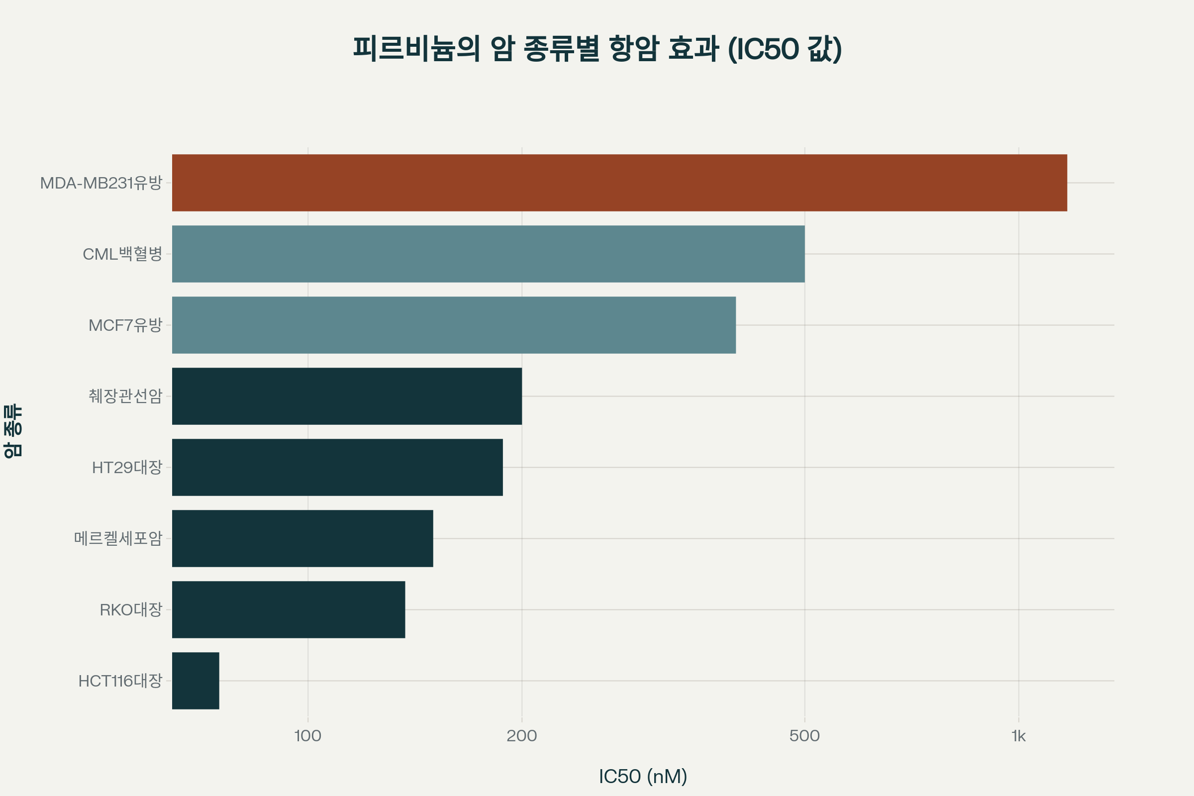 - 췌장암: PDAC 세포에서 200nM 이하의 강력한 효과